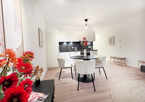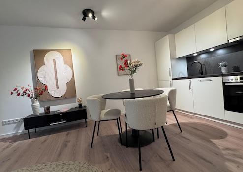 Eine exklusive Einbauküche mit modernen Großgeräten ist im Mietpreis bereits enthalten. Der Designvinylboden in Holzoptik verleiht den Räumen eine warme Atmosphäre und ist gleichzeitig pflegeleicht und langlebig. Im Badezimmer schaffen elegante Designfliesen im Format 60x60 cm ein modernes und stilvolles Ambiente. Für Sicherheit und Komfort sorgt eine Videogegensprechanlage. Elektrische Rollläden ermöglichen eine einfache Lichtregulierung, während die Fußbodenheizung in allen Räumen für behagliche Wärme sorgt.
