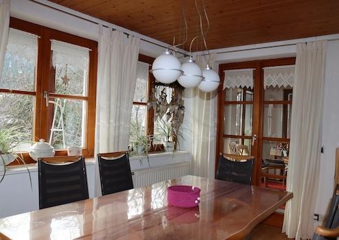 Der Mittelpunkt des Hauses: Ein lichtdurchfluteter Wohnbereich, der gleich durch zwei Türen betreten werden kann. Ein behaglicher Kachelofen sorgt hier ebenso für Wärme wie klassische Wandheizkörper. Von hier sowie von der Küche gelangen Sie in das Esszimmer – auch ideal als Wintergarten nutzbar – mit direktem Zugang zum Balkon und traumhaftem Blick über Garten und Park.