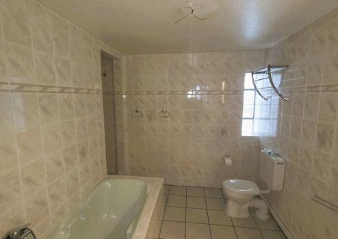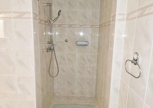 Dem Wohnzimmer schließt sich das Badezimmer an. Es ist zeitlos eingerichtet mit einer Badewanne und einer Dusche. Gleichzeitig beinhaltet der helle Raum die Gastherme.