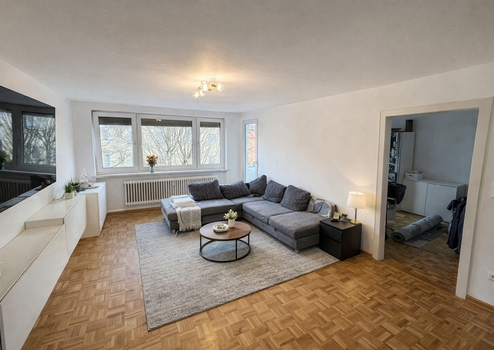 Der großzügige Wohnbereich bildet das Herzstück der Wohnung und bietet ausreichend Platz für Wohnen und Entspannen. Große Fenster sorgen für viel Tageslicht und eine angenehme Atmosphäre. Ergänzt wird das Raumangebot durch eine separate Küche, ein Badezimmer sowie ein separates WC – ideal für zusätzlichen Komfort im Alltag.