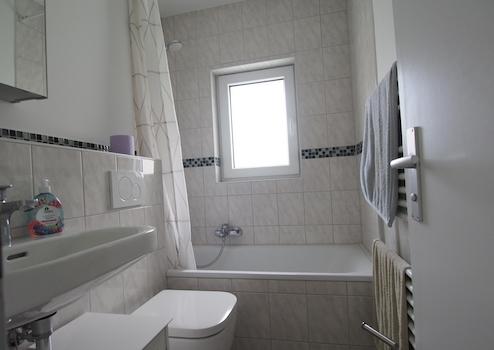 Das Badezimmer wurde aufwendig renoviert. Hell und modern kann man hier in Ruhe morgens wach werden. Das Bad ist ausgestattet mit einem großen Spiegel, Waschtisch, Toilette und Badewanne.