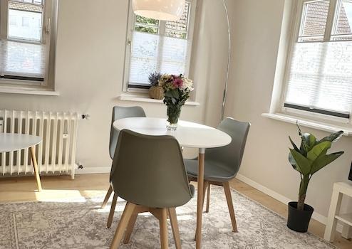 Diese helle und vollständig möblierte 2-Zimmer-Wohnung befindet sich im 1. Obergeschoss eines charmanten Hauses im Herzen von Plieningen.
