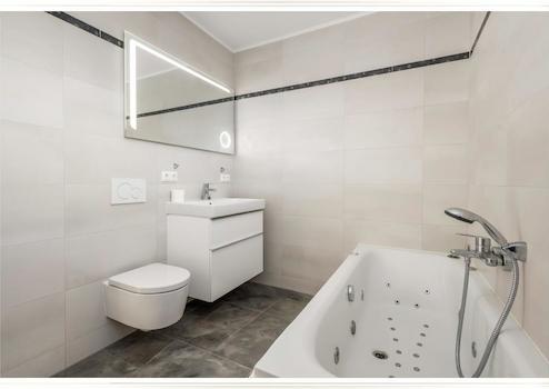- Großes Badezimmer mit Whirlpool-Badewanne und Waschmaschinenanschluss