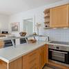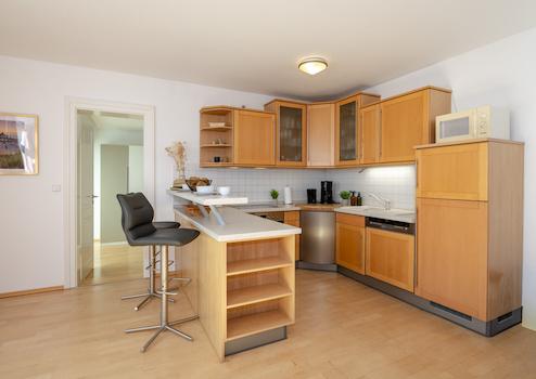 Kochen & Schnacken: Offene Küche mit allem Drum und Dran und ein großer Esstisch.
