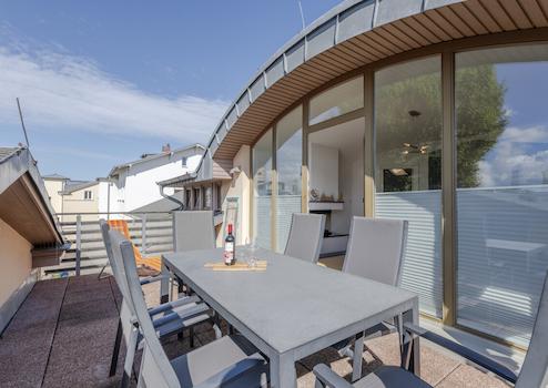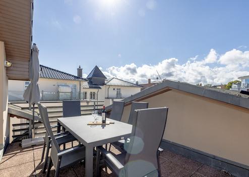 Dein Highlight: Die Dachterrasse mit seitlichem Meerblick – hier schmeckst Du die Ostsee beim ersten Kaffee.