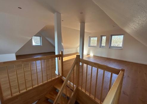 Die großzügige Wohnung erstreckt sich über zwei Ebenen im Obergeschoss und Dachgeschoss eines attraktiven Zweifamilienhauses und bietet jede Menge Raum und Flexibilität für individuelle Wohn-und Gestaltungskonzepte. Zwei moderne Tageslichtbäder mit Wanne und Dusche, die helle Einbauküche sowie der Balkon und der eigene Garten in Süd-West Ausrichtung runden das Gesamtbild dieses interessanten Immobilienangebots harmonisch ab.