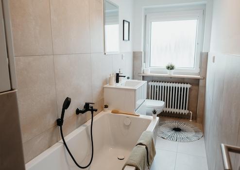 -> Komplettrenoviertes Bad: Neue Badewanne, Toilette und Waschtisch mit Unterschrank