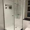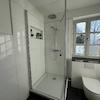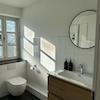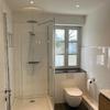Ein modernes Tageslichtbad, der Vinyl-Bodenbelag in Holzoptik sowie glatt verputzte puderweiße Wände und Decken runden die geschmackvolle Ausstattung ab.