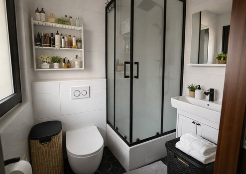 Tageslicht Badezimmer: Stilvolle Fliesen, Dusche und Fenster für natürliche Belüftung.