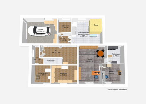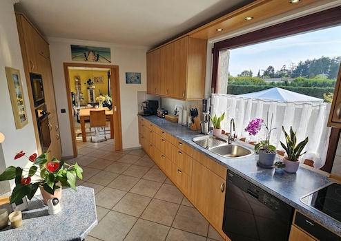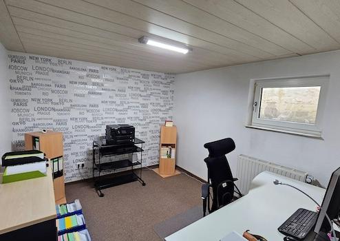 -Nutzfläche im teilweise als Büro ausgebautem Keller ca. 135 m² inkl. Garage mit elektrischem Tor und direktem Hauszugang. Alle Kellerräume haben ein Fenster, Tageslicht und können gelüftet werden.