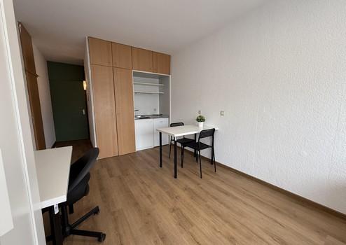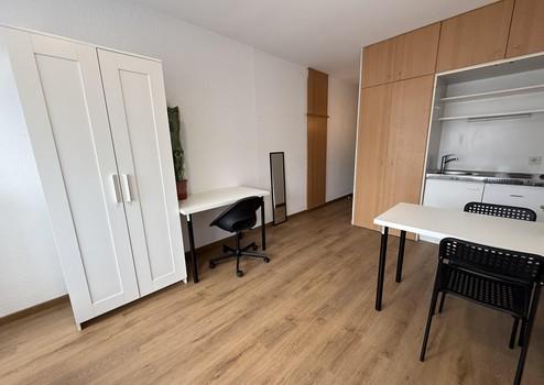 Komplett möbliert: Bett, Schreibtisch, Stuhl, Kleiderschrank, Regal, Küche mit Kühlschrank und Kochfeld