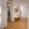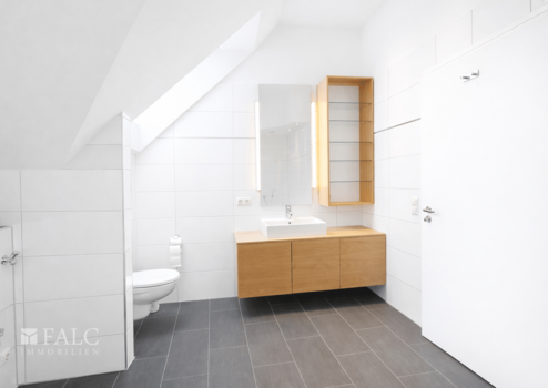 Entlang des Flurs befinden sich das Badezimmer mit Tageslicht, ein separates Gäste-WC sowie eine praktische Abstellkammer. Das Badezimmer ist funktional und geschmackvoll ausgestattet und verfügt über einen beleuchteten Spiegel, ein Regal sowie einen Waschtischunterschrank.