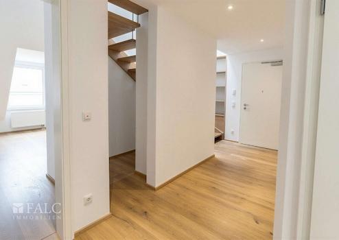 Von hier aus gelangen Sie auf die Dachterrasse, die zum ruhigen Innenhof ausgerichtet ist. Die geschützte Lage bietet viel Privatsphäre und lädt zu entspannten Stunden im Freien ein.