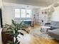 Das Wohnzimmer ist großzügig geschnitten und modern eingerichtet. Neben einem komfortablen Ecksofa mit Schlaffunktion bietet der Raum einen eleganten Keramiktisch, einen großen Essbereich aus Echtholz mit vier Stühlen sowie einen 65-Zoll-Fernseher. Ergänzt wird der Raum durch zwei Sideboards, ein Wandregal, einen Schubladenschrank sowie einen Arbeitsbereich mit Schreibtisch und Bürostuhl.