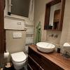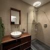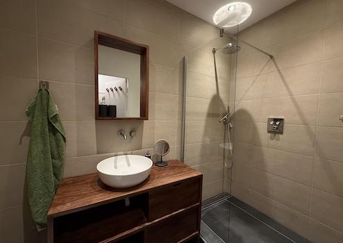 Das Badezimmer ist hochwertig ausgestattet und verfügt über eine großzügige Walk-in-Regendusche mit Thermostat. Die Sanitäranlagen stammen von Villeroy & Boch.
