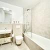 Ein Waschmaschinenanschluss befindet sich im wunderbar neuen und modernen Bad mit Badewanne und Regenwasserdusche.