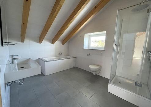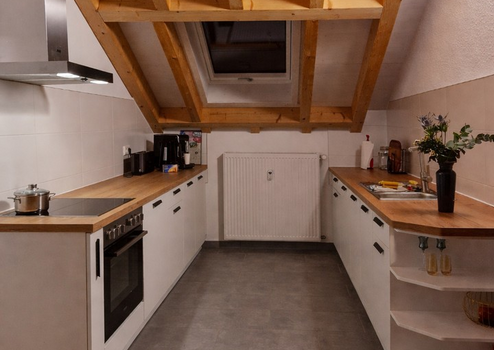 Sie besticht durch ihre hochwertige Ausstattung und die sehr ruhige Ortsrandlage direkt an Wiesen und großem Garten. Stilvolle sichtbare Holzbalken setzen besondere Akzente und verbinden modernen Wohnkomfort mit wohnlicher Gemütlichkeit in hellen freundlichen Zimmern mit Südausrichtung. Dank der Überhöhe wirkt die Wohnung offen, lichtdurchflutet und bietet ein außergewöhnliches Raumgefühl.