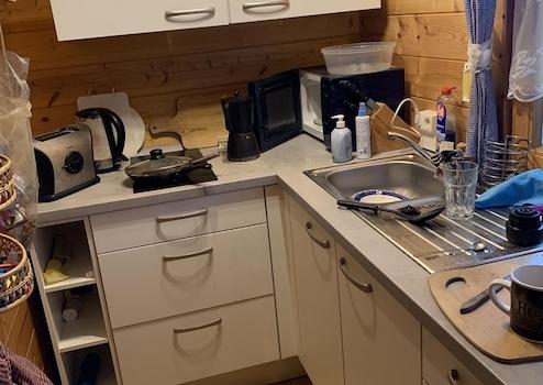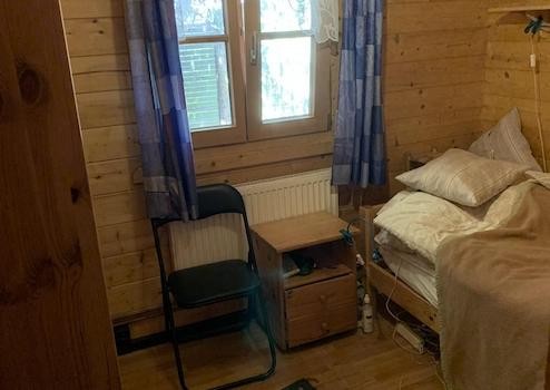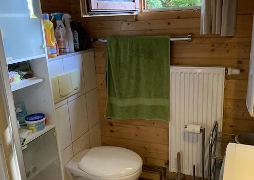 Das Blockbohlenhaus verfügt über einen separaten Eingangsbereich mit Garderobe und Mehrzweckschrank. Zur rechten Hand befindet sich die Küche mit einer neuen Kücheneinrichtung, daneben ein Duschbad mit temperaturregulierter Dusche, Waschbecken und wandanhängendem WC, Waschmaschine und mit einer Heizeinheit.