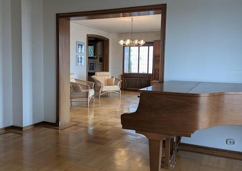 Im Erdgeschoss befinden sich der großzügig gestaltete Eingangbereich, eine Küche, das große Wohnzimmer mit Zugang zur großen Terasse, sowie ein Musizierzimmer und ein Esszimmer, welche sich in offener Bauweise an das Wohnzimmer anschließen.