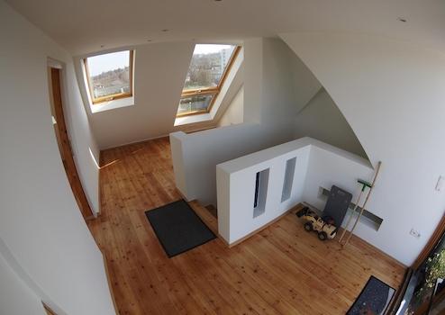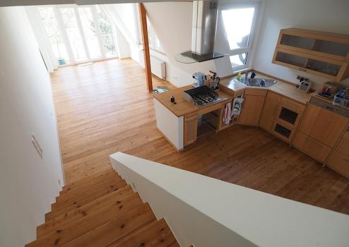 Die Wohnung wurde Anfang 2026 professionell vom Handwerker renoviert, alle Wände neu gestrichen und der massive Holzfussboden aus Lärchenholz geschliffen und versiegelt. Es gibt ein Kinderzimmer / Schlafzimmer, ein großzügiges Badezimmer und einen großen Küchen- / Wohnzimmerbereich im 3. OG. Über eine kurze Treppe erreicht man das DG mit einem weiteren Zimmer, das bislang als Schlafzimmer genutzt wurde, sowie einem Vorraum mit Zugang zum großen Dachgarten, der einen Rundumblick über Bonn bietet. Aufgrund der großen Fensterflächen haben wir im DG auch im Winter kaum heizen müssen. Die Wohnung verfügt über verschiedene Einbauschränke und Kammern, so dass es an Stauraum nicht mangelt.