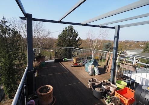 Der Dachgarten liegt in südwest Lage, Sonne ab Mittag bis Sonnenuntergang. Die Terrasse wurde 2010 neu aufgebaut mit Bambusterrassendielen, sehr witterungsresistent. Strom- und Wasseranschluß sind draussen verfügbar.