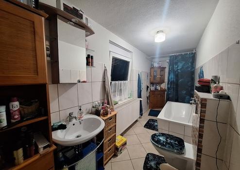 Die Fußbodenbeläge wechseln auf dieser Ebene zwischen Laminat und Fliesen. Das Badezimmer mit Dusche und Wanne befindet sich in einem 1977 errichteten Anbau.