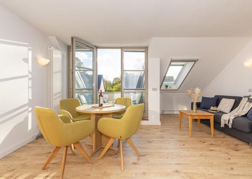 Und abends? Ein Glas Wein auf dem Balkon, der Blick über das Achterwasser, die Sonne versinkt langsam am Horizont – genau hier entsteht das Gefühl: Ja, das ist es.