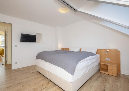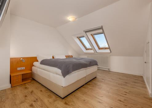 Schlafzimmer mit komfortablem Doppelbett, großem Kleiderschrank und zusätzlicher Abstellkammer – clever gelöst und äußerst praktisch