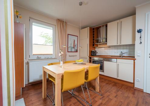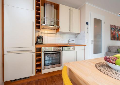 Die offene Küche ist bestens ausgestattet – und wenn Du bisher nicht gerne gekocht hast, könnte sich das hier ändern (Deine bessere Hälfte wird es begrüßen).