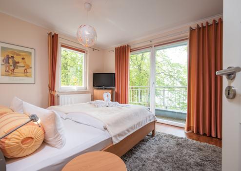 Das Hauptschlafzimmer bietet ein gemütliches Doppelbett, einen modernen Kleiderschrank und Zugang zum Balkon – damit Du den ersten Kaffee gleich mit Meeresluft genießen kannst.