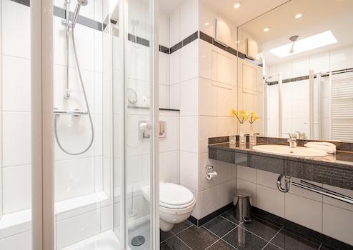 Das Badezimmer ist modern gestaltet, mit Dusche, WC und einer Lichtkuppel, die für natürliches Tageslicht sorgt.