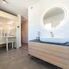 Familienbad und der Elternschlafbereich mit Ankleide und direktem Zugang zum Bad. Die
