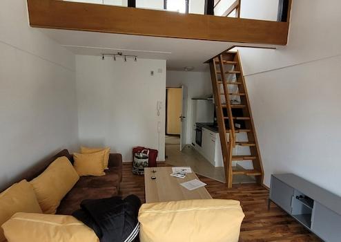 Der großzügige Wohn-Essbereich sowie der Schlafbereich im oberen Teil der Wohnung mit direktem Zugang zur (mit vier weiteren Parteien genutzten) Dachterrasse mit Panoramablick über die Stadt bieten ein urbanes Wohngefühl.