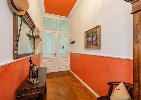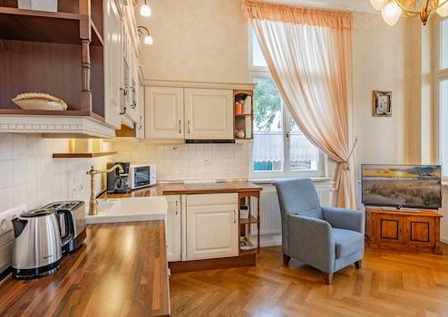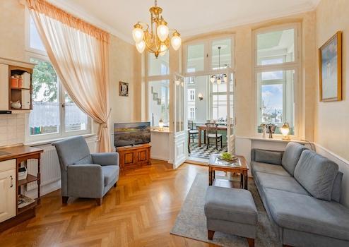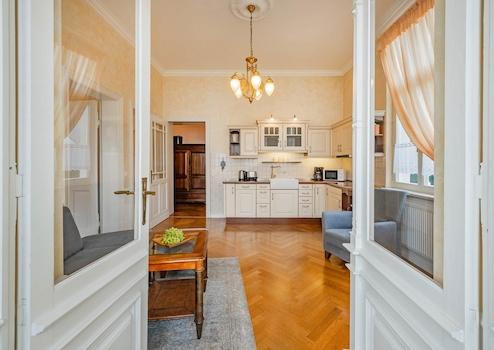 Du betrittst die Beletage und spürst sofort den Charme vergangener Zeiten – hohe Decken, ein Jugendstil-Kronleuchter über deiner Sofa-Lounge und ein Flatscreen-TV. Die Einrichtung? Ein stilvoller Mix aus Massivholzmöbel ...