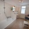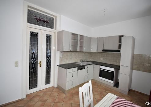 Die Wohnung auf der linken Seite besteht aus einer Diele, einem Schlafzimmer, einem geräumigen Badezimmer ausgestattet mit Badewanne, Dusche und WC. Die Küche mit Einbauküche und gemütlichem Sitzbereich hat eine große Fensterfront, ein zusätzliches Highlight ist hier die große aufgearbeitete Tür mit farbigen Glaseinsätzen. Direkt neben der Küche befindet sich ein sep Vorrratsraum. Desweiteren gibt es hier ein Esszimmer mit Kaminanschluss und ein Wohnzimmer. Zwischen Esszimmer und Wohnzimmer gab es einmal eine Verbindungstür. Diese wurde verschlossen, ist aber mit ein paar einfachen Handgriffen wieder zu öffnen, so das man sich hier wieder ein offenes großzügiges Wohnambiente schaffen kann.