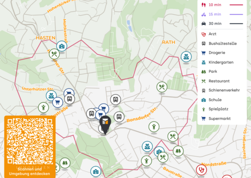 Die Anbindung an den öffentlichen Personennahverkehr ist gut: Mehrere Buslinien (z. B. 625, NE 7) verbinden Cronenberg mit dem Zentrum von Wuppertal und den umliegenden Stadtteilen. Dadurch sind sowohl Arbeitsplätze als auch Freizeit‑ und Einkaufsziele schnell erreichbar. Zudem sorgt die Nähe zu wichtigen Hauptverkehrsachsen für eine komfortable Erreichbarkeit mit dem Auto — insbesondere zur A46 und A1 in Richtung Düsseldorf, Köln, Dortmund oder ins Bergische Land.
