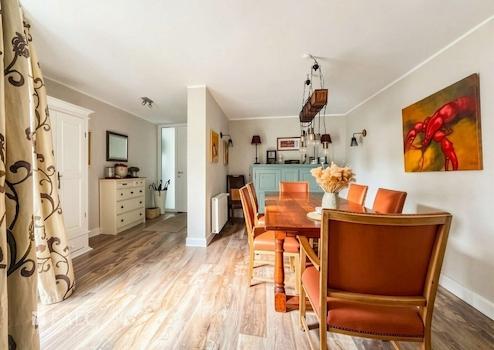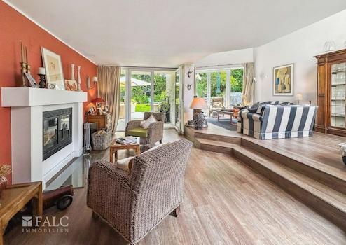 Der großzügige Wohnbereich bildet das Herz des Hauses. Hier gehen Wohnzimmer, Essbereich und Kaminzimmer fließend ineinander über und schaffen eine Atmosphäre, die sowohl für ruhige Abende als auch für gesellige Stunden mit Gästen ideal ist. Bodentiefe Fenster eröffnen den Blick in den geschmackvoll angelegten Garten und sorgen für eine besondere Lichtstimmung zu jeder Tageszeit.