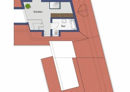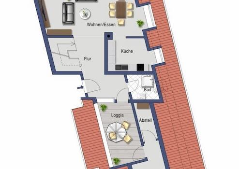 Die Maisonette-Wohnung ist sehr großzügig geschnitten, die Grundfläche ist dabei wesentlich größer als die offizielle Wohnfläche. Die zahlreiche Dachgauben bilden einen Kontrast zu den gemütlichen Dachschrägen.