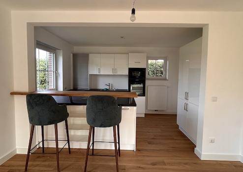 Der Wohn- und Essbereich mit integrierter, offener Einbauküche bildet das Herzstück der Wohnung und schafft eine einladende Atmosphäre.