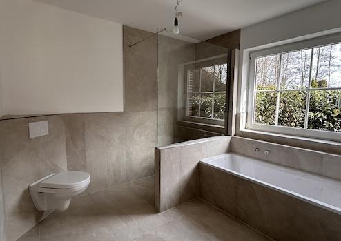 Das stilvolle Tageslichtbad ist sowohl mit einer Badewanne als auch einer Dusche ausgestattet und bietet Komfort auf hohem Niveau.