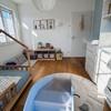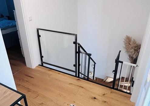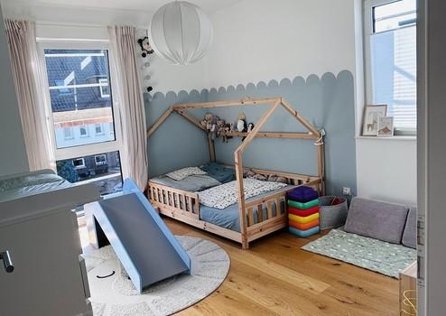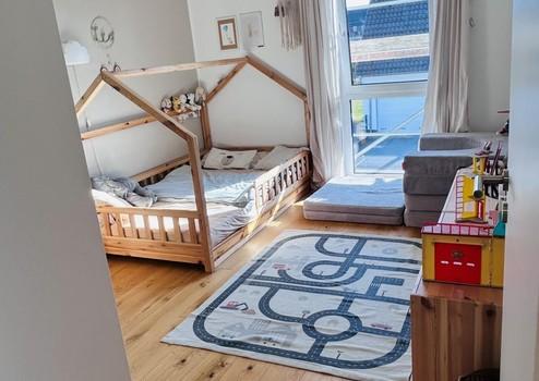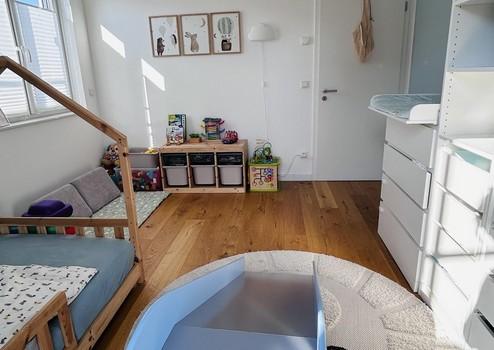 Das Obergeschoss verfügt über zwei Kinderzimmer, ein Bad mit Wanne und ebenerdiger Dusche sowie ein Elternschlafzimmer mit angrenzendem