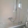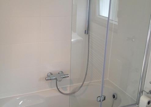 - Weiß gefliestes Badezimmer mit Badewanne, Fenster und Platz für die Waschmaschine