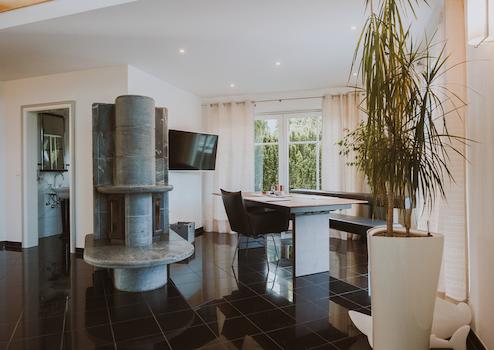 Der Essbereich im Erdgeschoss mit einem wunderschönen Schwedenofen ist perfekt für gemütliche Runden mit der Familie und Freunden.