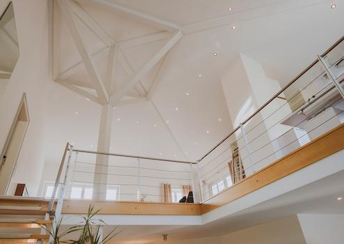 Man erreicht das Anwesen über eine großzügige Treppenanlage. Mit einer Wohnfläche von ca. 200 m², verteilt auf zwei Etagen, bietet dieses Haus ausreichend Platz für die ganze Familie. Insgesamt stehen Ihnen fünf Zimmer zur Verfügung, darunter drei helle Schlafzimmer, die zum Träumen einladen. Ein Highlight des Hauses ist die beeindruckende Galerie mit Sichtdachstuhl im Innenbereich – ein echter Hingucker, der dem Raum Tiefe und Eleganz verleiht.