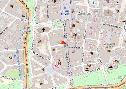 Die Petersstraße 26 liegt im Herzen von Leipzigs Innenstadt, einer der beliebtesten und belebtesten Einkaufsstraßen der Stadt. Sie verbindet den Marktplatz mit dem Wilhelm-Leuschner-Platz und ist als Fußgängerzone gestaltet, was für eine hohe Aufenthaltsqualität sorgt. In unmittelbarer Nähe befinden sich zahlreiche Einzelhandelsgeschäfte, Restaurants und Cafés, die das Viertel zu einem attraktiven Standort machen. Die Mädlerpassage und die Specks Hof Passage, zwei der bekanntesten historischen Passagen Leipzigs, sind nur wenige Gehminuten entfernt.