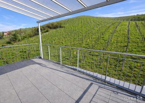 Der geräumige Balkon, angrenzend am Wohnbereich mit Blick auf die Weinberge, lädt zum Entspannen ein.