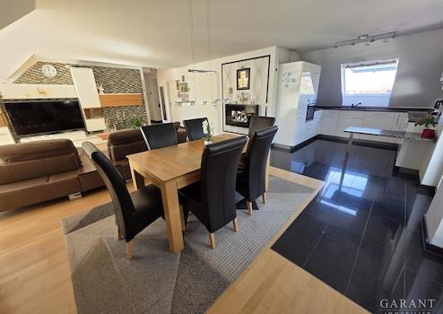 Der offene Wohn- und Essbereich bildet das Herzstück der Wohnung. Hier fügt sich die maßgefertigte Einbauküche stilvoll in den Wohnraum ein und ermöglicht ein modernes Wohnkonzept, bei dem Kochen und Wohnen fließend ineinander übergehen. Die Küche ist im Kaufpreis bereits enthalten.