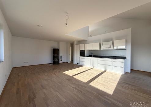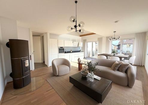 Der Wohn- und Essbereich im unteren Geschoss ist offen gestaltet, sehr hell und ausgewogen. Große Fensterflächen lassen viel Tageslicht herein, der Kaminofen schafft eine warme Wohnatmosphäre. Von hier aus gelangen Sie direkt auf den Südostbalkon - ideal für einen entspannten Start in den Tag.
