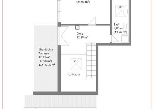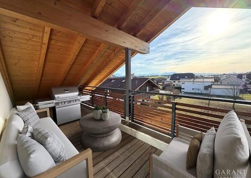 Ein besonderes Highlight ist die überdachte Dachterrasse mit Alpenblick. Sie erweitert den Wohnraum nach außen und bietet einen geschützten Bereich für ruhige Momente oder gesellige Abende.