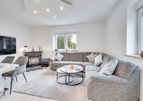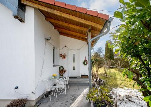 Im Erdgeschoss des Hauses befindet sich ein gemütliches Wohnzimmer, eine Einbauküche sowie ein frisch saniertes Badezimmer. Ein Kinderzimmer/Arbeitszimmer im Erdgeschoss macht das Wohnen besonders komfortabel. Der Eingangsbereich sowie der Flur und das Wohnzimmer verfügen zusätzlich über eine Fußbodenheizung. Im Obergeschoss finden Sie ein großzügiges Schlafzimmer und ein weiteres Kinderzimmer, das flexibel genutzt werden kann. Der große Dachboden bietet zudem ausreichend Stauraum. Neue Schallschutzfenster tragen dazu bei, dass Sie die Ruhe genießen können, ohne von Außengeräuschen gestört zu werden. Hinter dem Haus wurde eine großflächige Terrasse errichtet, welche durch den Garten, die Auffahrt aber auch das Wohnzimmer zu erreichen ist.